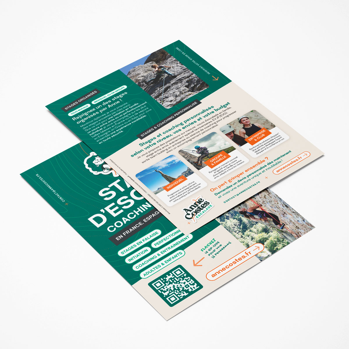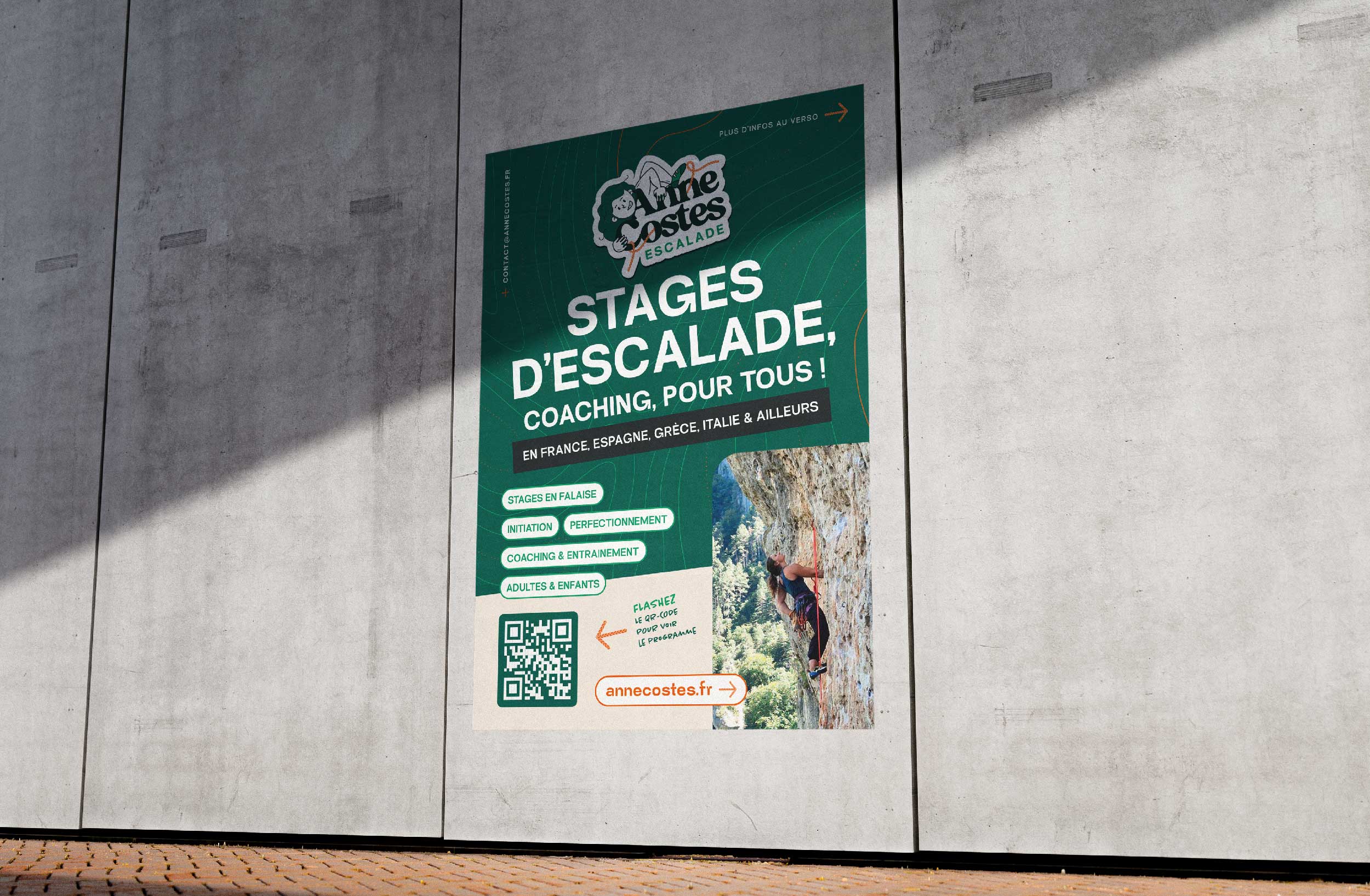 Pour renforcer la présence locale, l’identité graphique a été déclinée sur des supports physiques. Un flyer et une affiche ont été conçus pour être diffusés dans les salles d’escalade, les salles de sport, les bars fréquentés par la communauté outdoor ainsi que les boutiques spécialisées.